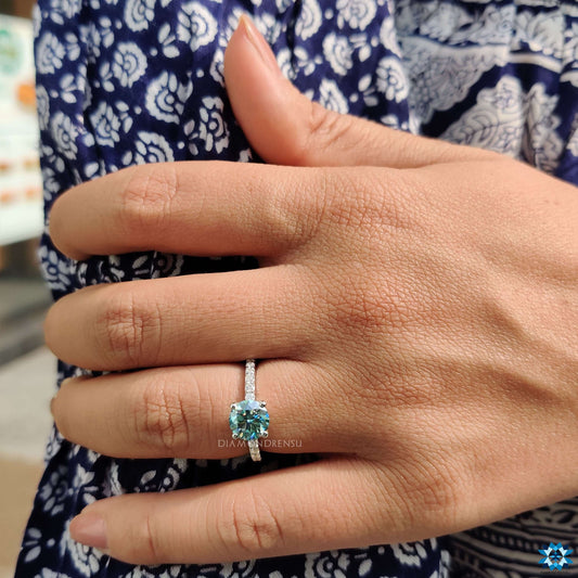 Sale1.25 CT Round Brilliant Cut Cyan Blue Moissanite Ring, Pave Engagement Ring