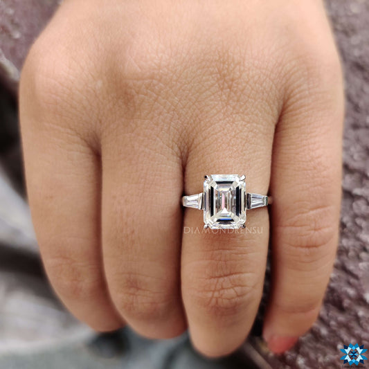 SaleCathedral Setting Three Stones Engagement Ring, 3.89 TCW Emerald and Tapered Baguette Cut Three Stone Moissanite Engagement Ring